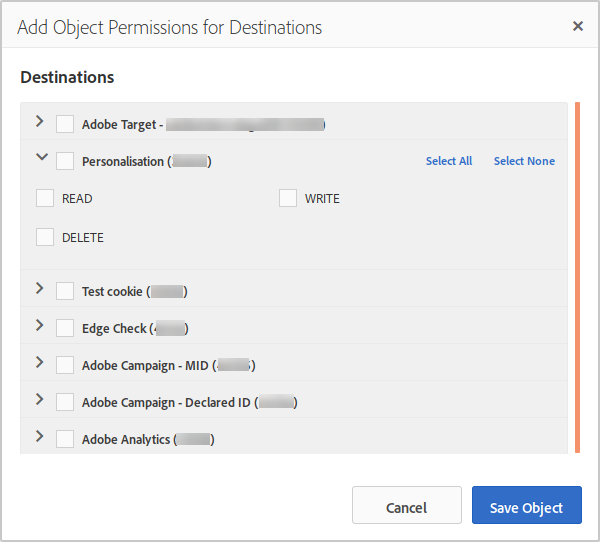 Click on “Save Object” when you finish the permissions for each type of data. As mentioned above, in a simple case, you would create one group per tenant, where you would grant all permissions to the data sources and destinations corresponding to that tenant. However, fine-grained options can also be created, selecting sub-sets of the permissions for each data source or destination. As you can see, AAM options are almost limitless.