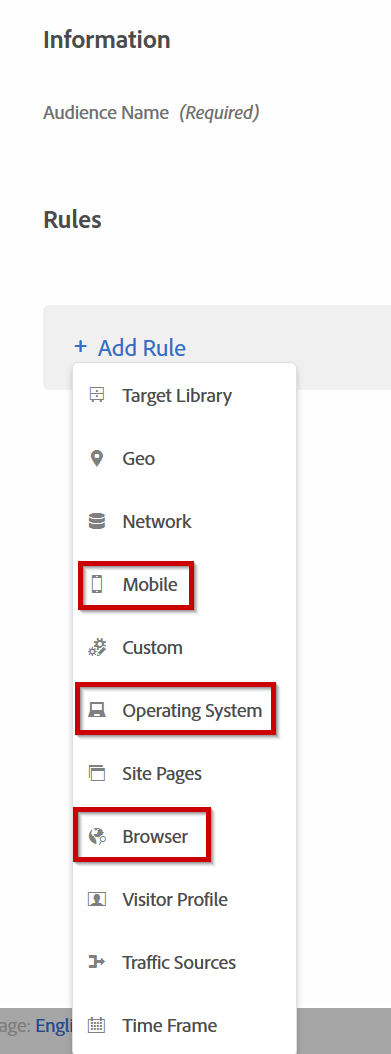 Target only uses the User-Agent to create audiences. You can find it, indirectly as usual, in the “New Audience” wizard, in the following rules: