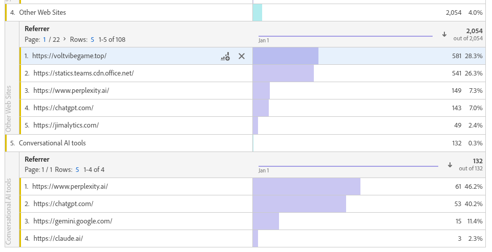 To me, this is the most interesting report to evaluate in 2025. As I said above, AI is replacing search engines at a slow but steady pace. I can already see it in the traffic sources report: